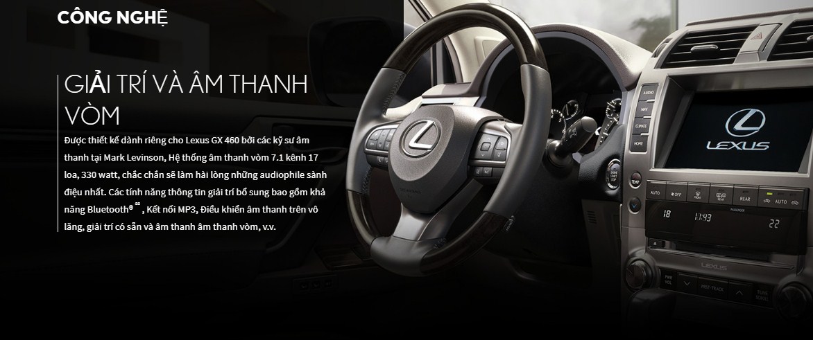Được thiết kế dành riêng cho Lexus GX 460 bởi các kỹ sư âm thanh tại Mark Levinson, Hệ thống âm thanh vòm 7.1 kênh 17 loa, 330 watt, chắc chắn sẽ làm hài lòng những audiophile sành điệu nhất. Các tính năng thông tin giải trí bổ sung bao gồm khả năng Bluetooth® 22 , Kết nối MP3, Điều khiển âm thanh trên vô lăng, giải trí có sẵn và âm thanh âm thanh vòm, v.v.
