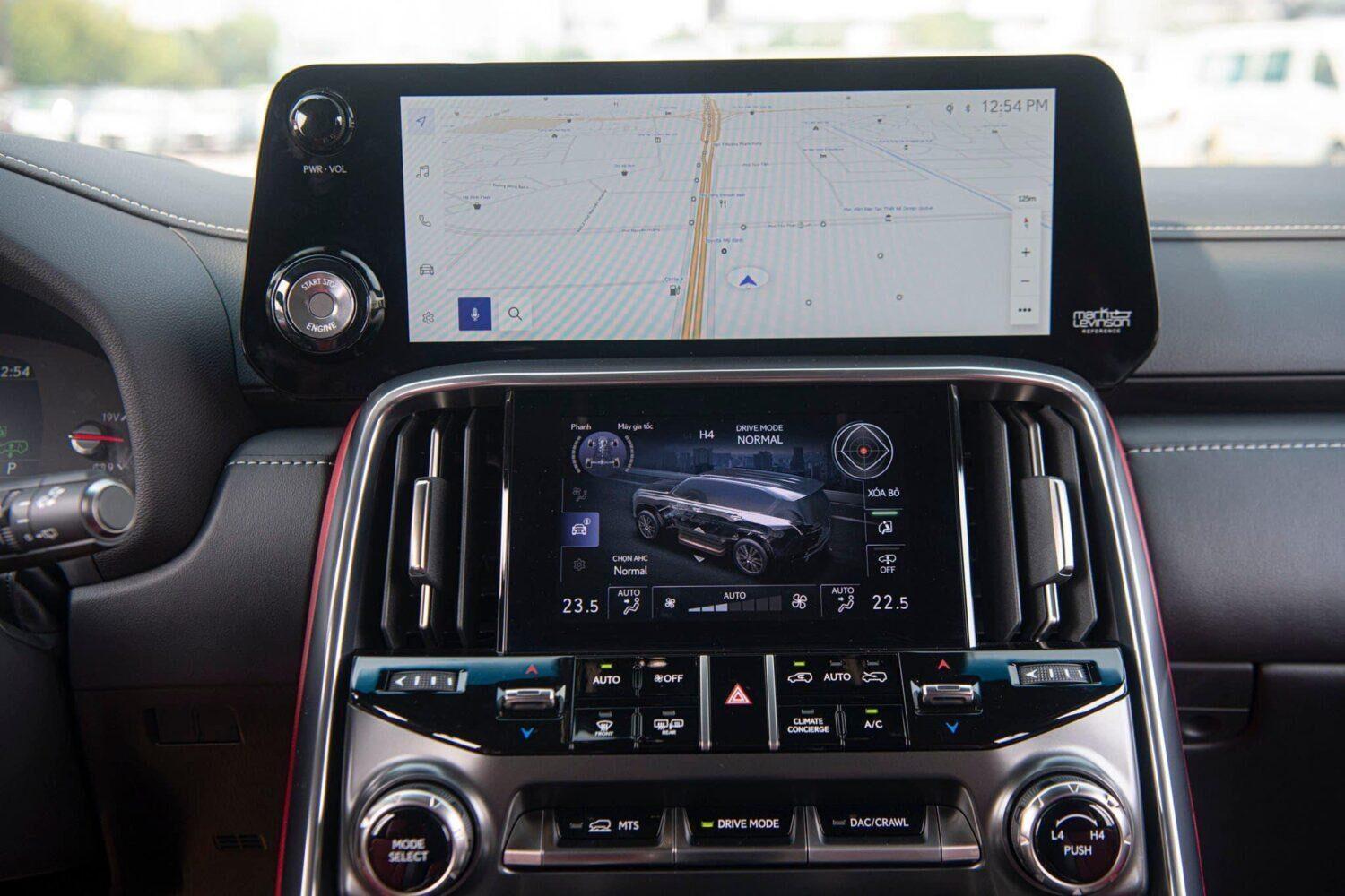 Lexus LX 600 F Sport 2025 được trang bị hệ thống giải trí hiện đại với màn hình cảm ứng kép. Phía trước là màn hình cảm ứng trung tâm 12.3 inch, hỗ trợ các chức năng giải trí, điều hướng và quản lý thông tin xe, cùng với màn hình phía dưới 7 inch dùng để điều chỉnh điều hòa và các tính năng tiện ích khác.